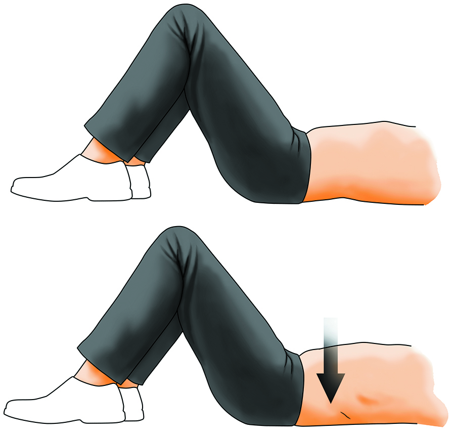 Lie on your back with your knees bent and your feet flat on the floor. Use your abdominal muscles to flatten the arch in your lower back and push your belly button toward your spine. Hold for 5–10 seconds. Do three sets of 10 repetitions.