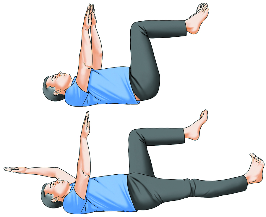 Lie on your back, with your arms raised straight above your chest and your knees and hips bent at a 90-degree angle. Engage your abdominal muscles as you slowly bring your left arm overhead and extend your right leg, stopping them a few inches above the floor. Gradually return your leg and arm to the starting position, and then repeat with the opposite limbs. Aim for 2–3 sets of 10 repetitions, or whatever is comfortable for you.