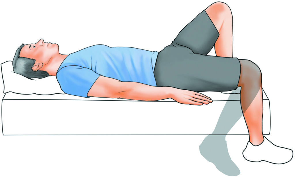Lying on your back near the left edge of your bed, bend your right leg, keeping your right foot flat on the bed. Hang your left leg over the edge, keeping the leg relaxed and your thigh resting flat against the bed. Hold for 20 seconds, and then repeat with the opposite leg on the right edge of the bed. Do 3–5 repetitions with each side daily.