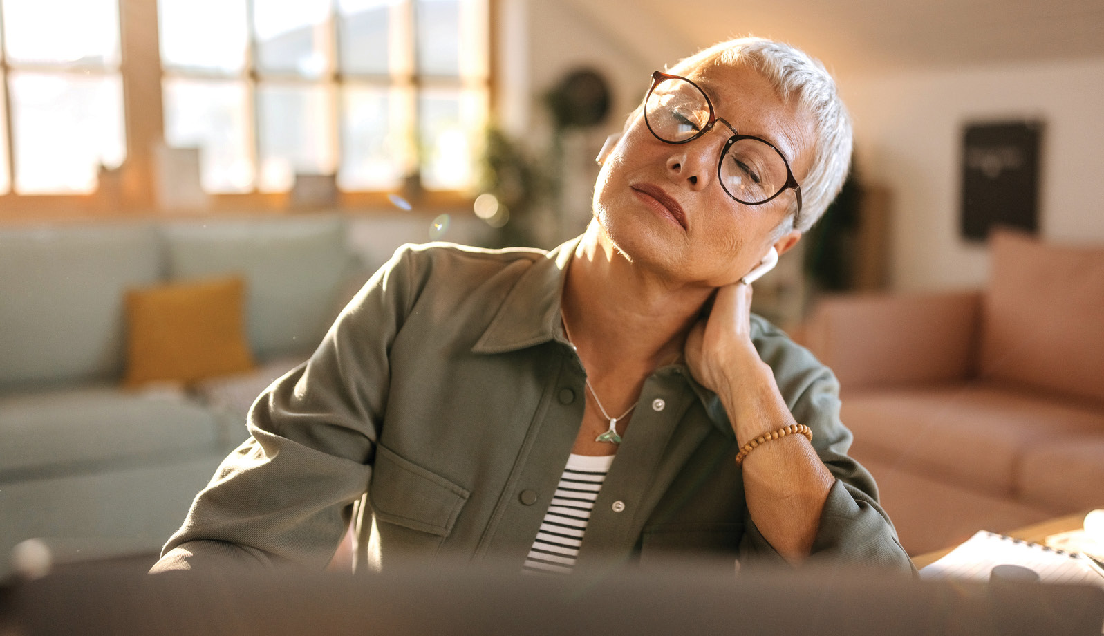 Caution: When we have limited range of motion in our neck, we often stretch by rolling our head all the way around in circles. Don’t do this—the combination of motions put the head and neck in an extreme position that can put undue stress on the cervical spine.